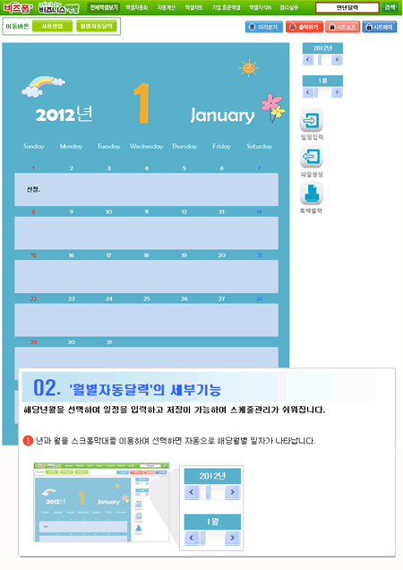 9,000원/월블루계열의 디자인에 해당년/월을 선택하여 일자별 메모내용을 입력하고 저장하여 관리할 수 있는 엑셀자동화서식입니다.