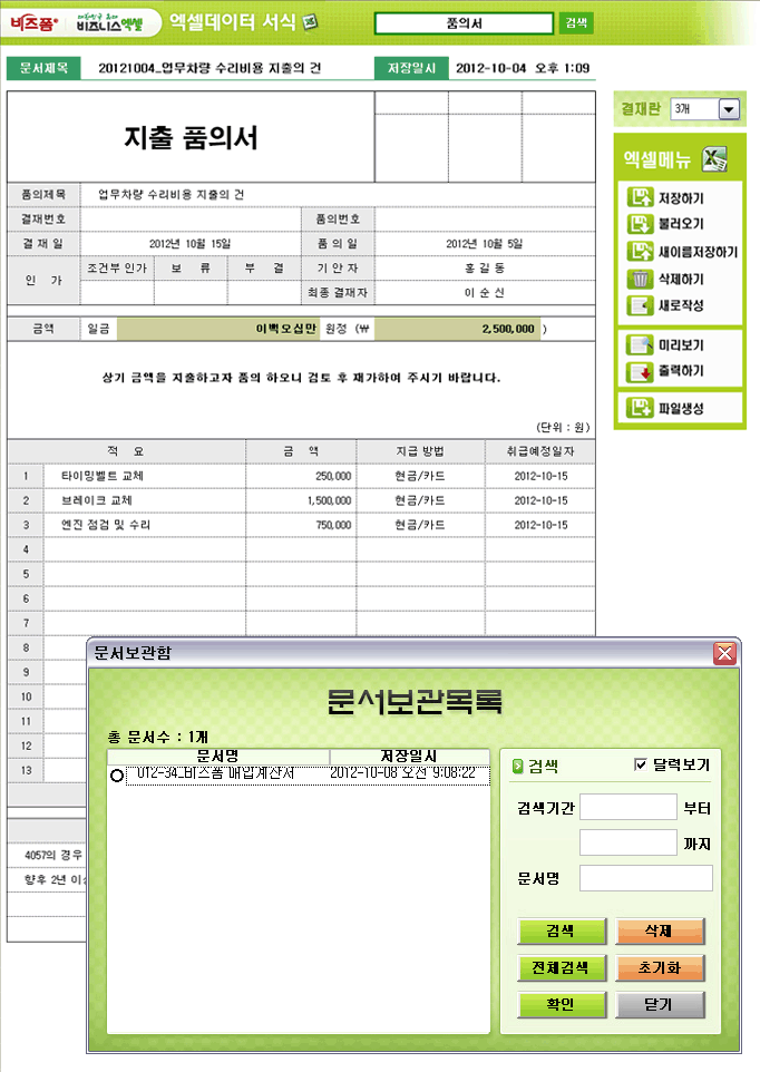 9,000원/월지출안에 대한 품의서로 내역과 첨부사항을 작성하면 건별로 저장/수정/불러오기가 가능한 엑셀데이터 서식입니다.