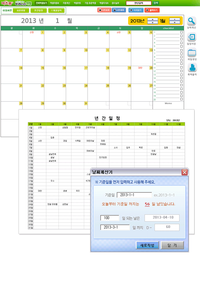 9,000원/월1월~ 12월까지 연간일정을 미리 입력해놓으면, 월별 달력에서 해당내역을 자동으로 확인할 수 있으며, 일정을 입력,누적관리할 수 있는 월간스케줄 달력으로 날짜계산기 기능이 추가된 엑셀 자동화 서식입니다.