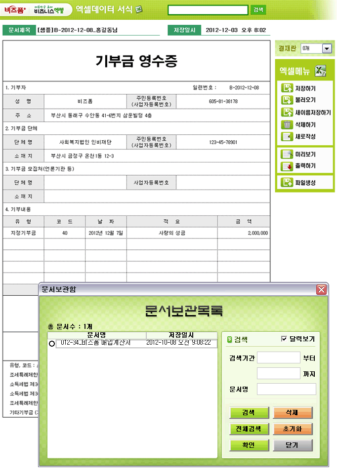 9,000원/월연말정산때 많이 발행하게 되는 기부금 영수증, 후원금 영수증 표준 서식을 건별로 저장/수정/불러오기 등 자동화 기능이 포함된 엑셀 데이터 서식으로 이메일 발송을 위한 별도 파일 생성도 가능합니다.