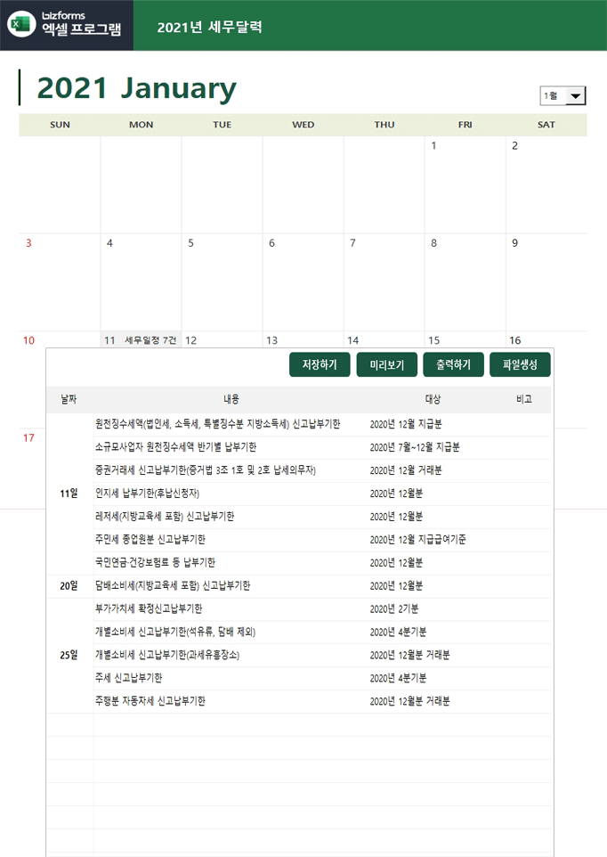 파일생성 : 해당 월의 달력 및 세무일정을 다른 엑셀 파일로 저장할 수 있습니다.