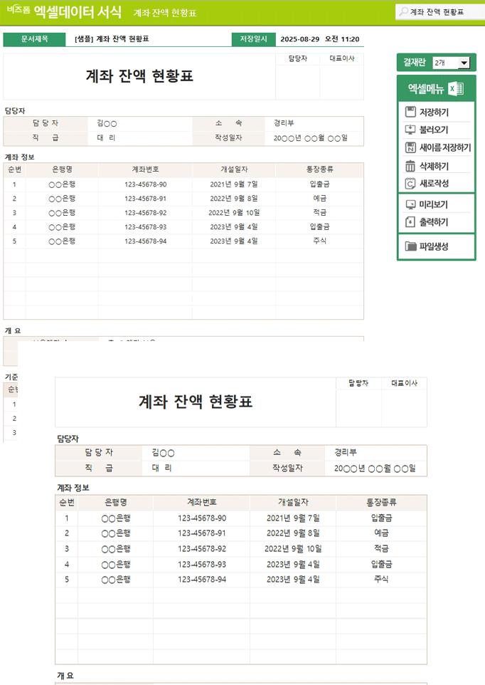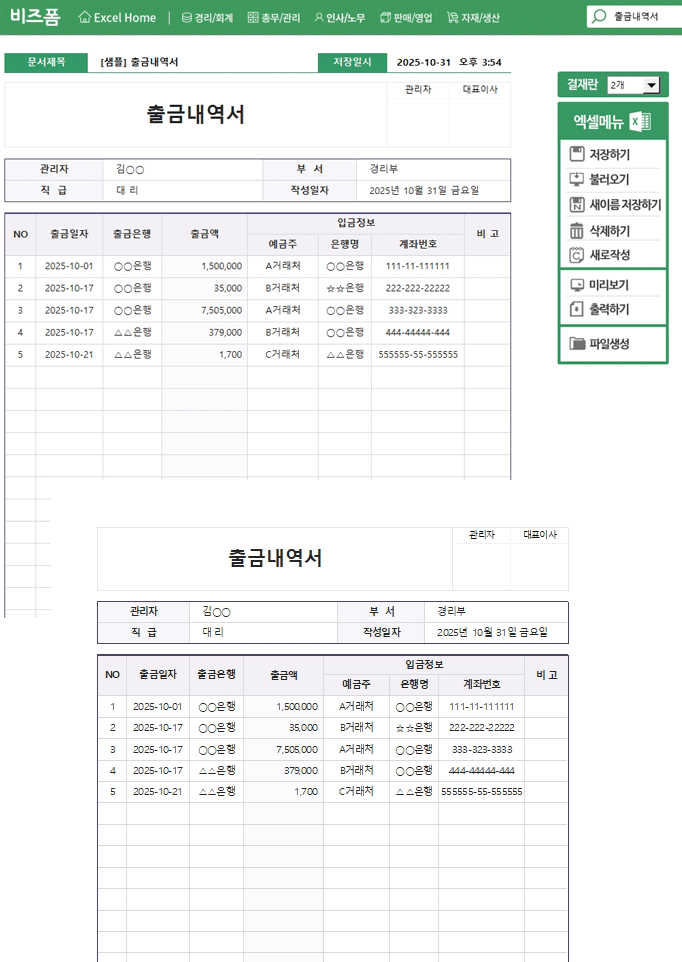 입출금 통합관리 프로그램 (통장출납장, 카드출납장, 현금출납장, 총계정원장, 일계표, 월계표, 년계표)