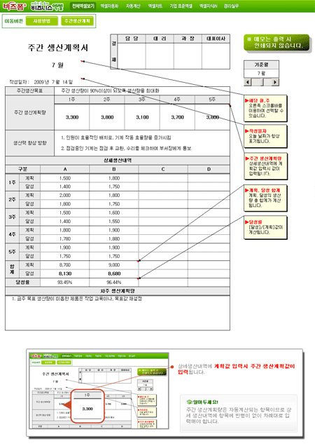 9,000원/월주별로 생산계획을 알수있는 서식으로서, 합계, 달성률 항목이 자동계산되는 서식입니다.
