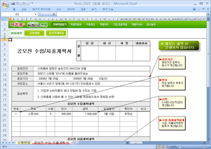 9,000원/월공모전 수입/지출내역을 알수있는 서식으로서 수입,지출계획내역항목이 자동계산되는 서식입니다.