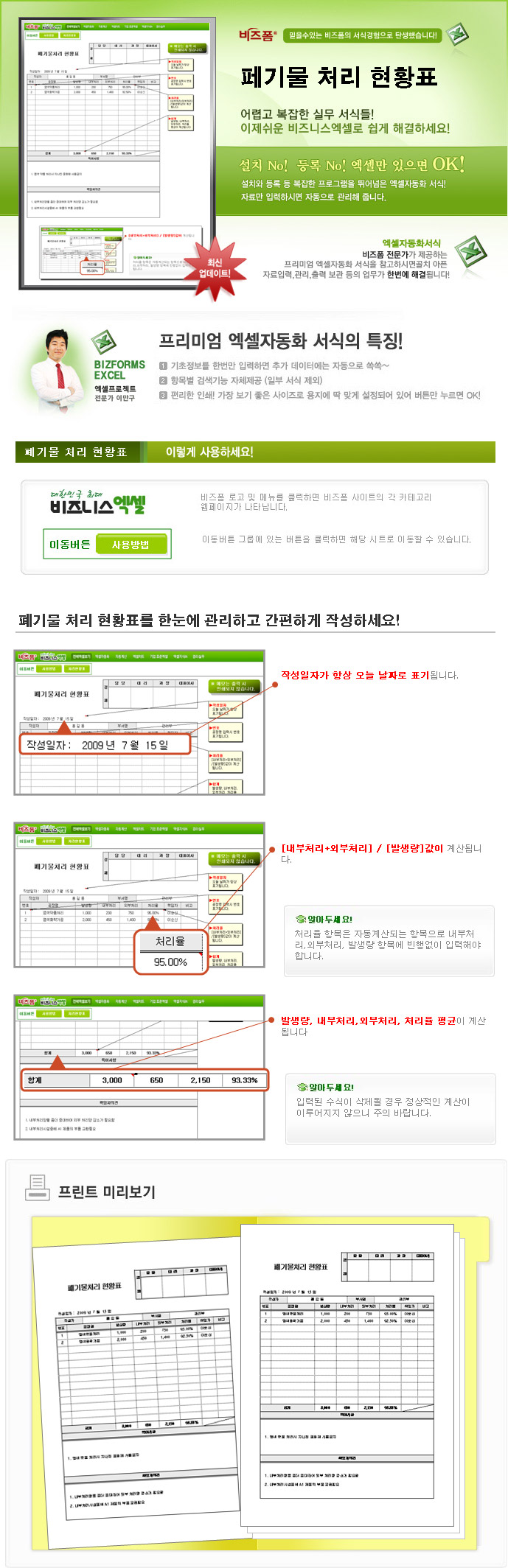 9,000원/월페기물 처리 현황을 알수있는 서식으로서 발생량, 외부처리, 내부처리 항목입력시, 처리율, 합계, 평균처리율이 자동계산됩니다.