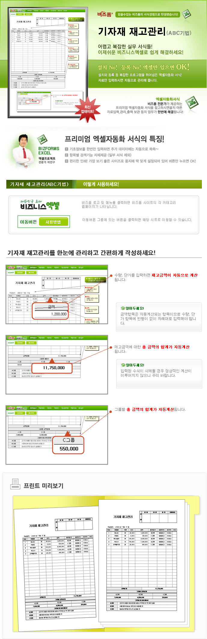 9,000원/월기자재를 abc 3그룹으로 나누어 재고관리상황을 알수있는 서식으로서 금액, 그룹별 금액합계가 자동계산됩니다.