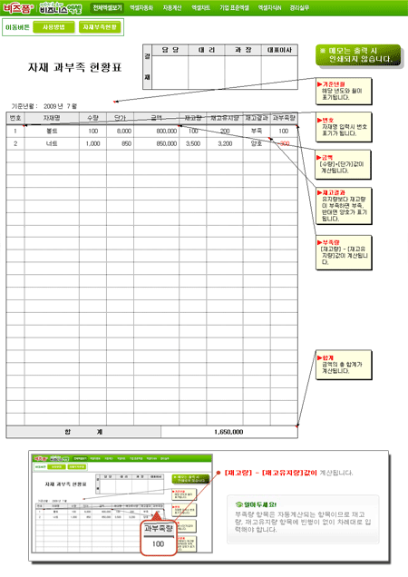 9,000원/월자재과부족 현황을 살펴볼 수 있는 서식으로서 금액, 과부족량, 합계 항목이 자동계산됩니다.