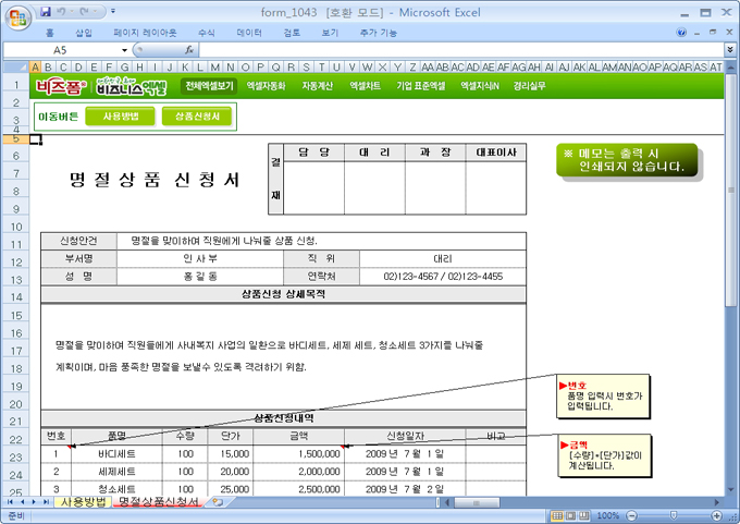 9,000원/월수량, 단가를 입력하면 금액, 합계금액이 자동계산되는 서식입니다.
