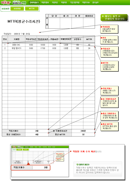 9,000원/월작업시작시간, 종료시간 입력시 작업시간이 자동계산되며, 기계정지시간, 고장횟수 입력시 MTTR이 자동계산됩니다.