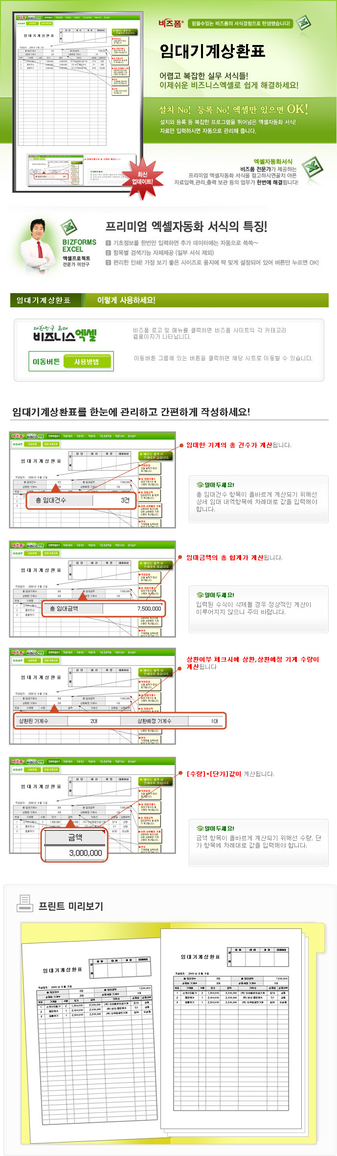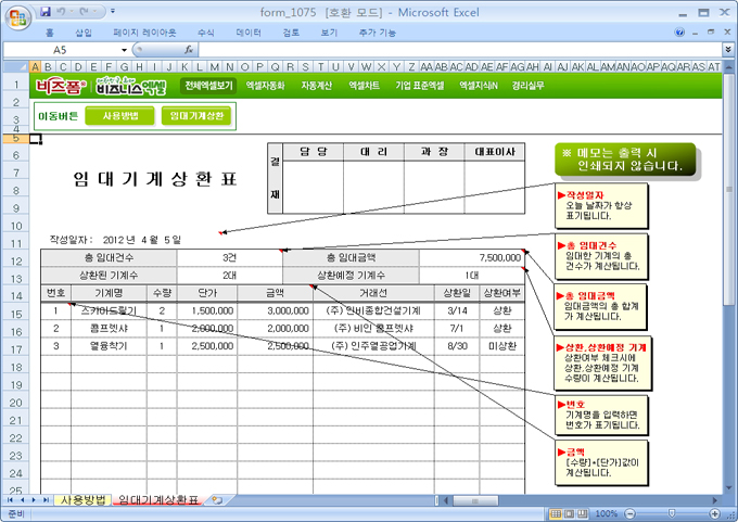 9,000원/월임대기계 내역을 확인할 수 있는 서식으로서 총 임대건수, 총 임대금액, 상환된 기계수, 상환예정 기계수 항목이 자동계산됩니다.