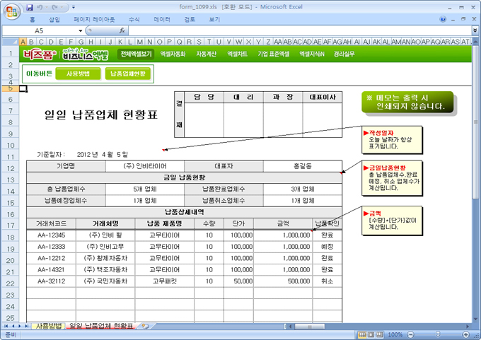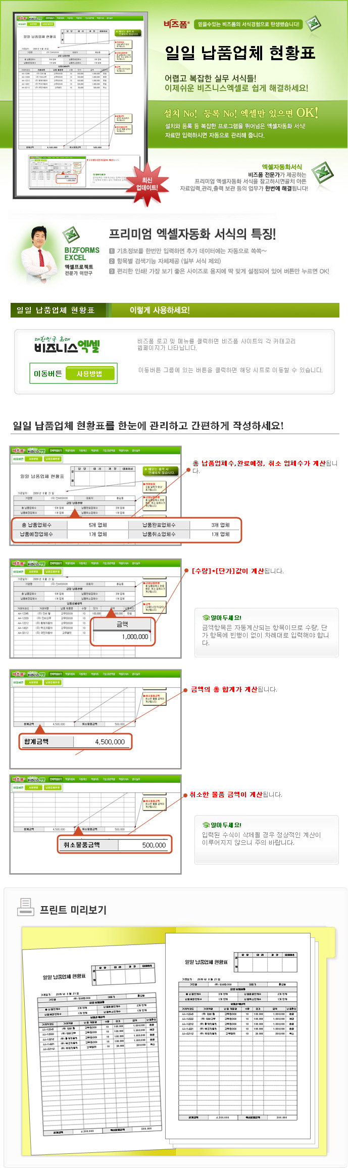 9,000원/월납품제품명의 수량 단가 입력시 금액이 계산되며, 납품확인 입력시 금일 납품현황이 계산됩니다.