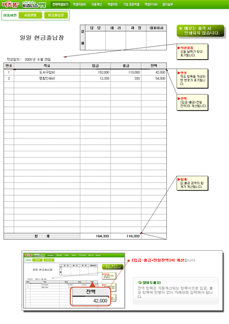 9,000원/월하루 동안의 입,출금내역을 알수있는 서식으로서 입금, 출금입력시 잔액이 계산됩니다.