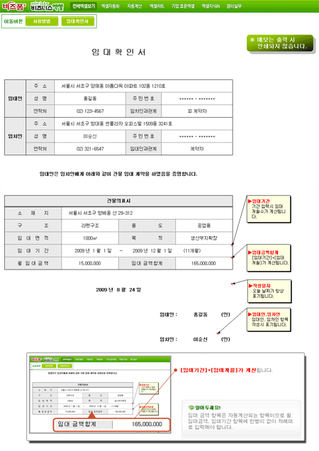 9,000원/월건물임대확인을 알 수있는 서식으로서 임대기간, 임대금액, 작성일자가 계산됩니다.
