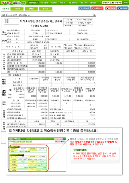 9,000원/월입력폼과 출력폼으로 구분되어 입력폼에 퇴직근로 정보 및 금액을 입력하면 결정세액 및 퇴직소득세액이 계산되어 퇴직소득원천징수영수증을 출력할 수 있습니다.[별지 24호(2) 2009.4.14)