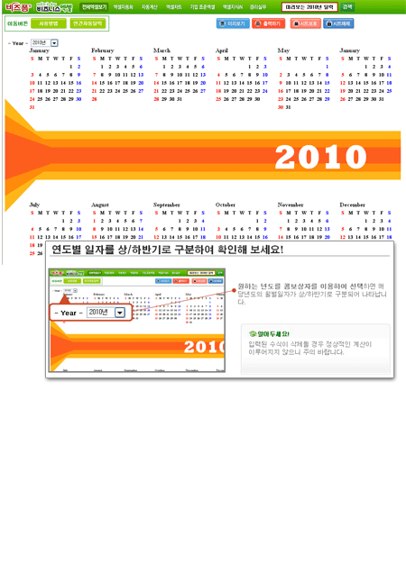 9,000원/월년도를 콤보상자를 이용해 선택하면 해당년도별 월별일자를 상하반기로 구분하여 자동으로 확인할 수 있는 연간자동달력(상,하반기구분) 서식입니다.