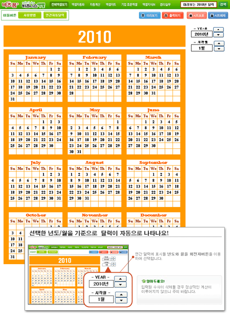 9,000원/월회전자 버튼을 이용하여 년도와 시작할 월을 선택하면 자동으로 선택한 년도/월을 기준으로 나타나는 연간자동달력(주황배경무늬) 서식입니다.