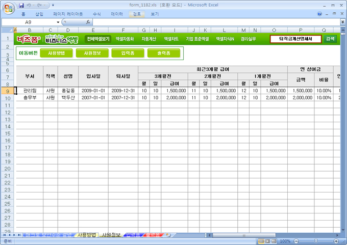 추가된 사원정보시트에서 사원의급여를 관리하고, 퇴사자의 개인정보와 임금정보를 등록하면 자동으로 퇴직금과 퇴직소득세, 주민세를 계산하여 주는 엑셀자동화서식입니다.