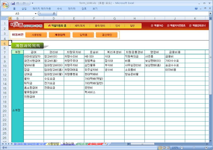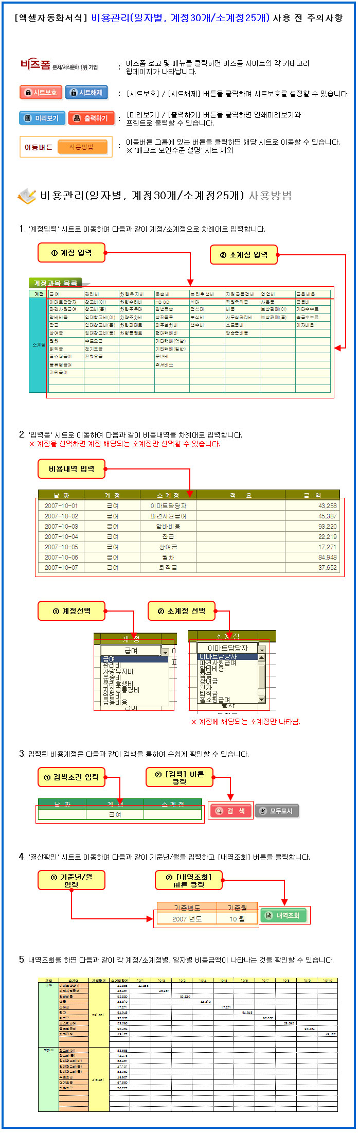 9,000원/월계정은 30개/소계정은 25개까지 입력할 수 있으며, 비용발생내역을 건당 입력하면 입력내용이 누적되어 전체적인 비용데이타를 관리할 수 있는 엑셀자동화 서식입니다.