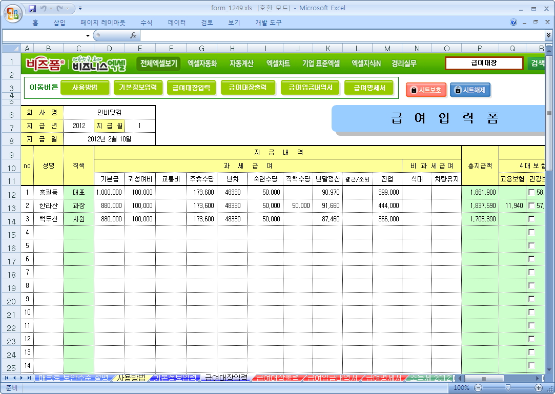 총 50명의 사원을 급여지급내역에서 과세10개,비과세로 구분하며 사원 당 공제내역을 선택할 수 있어 해당 공제내역의 계산을 임의적으로 지정할 수 있는 엑셀자동화 서식입니다.