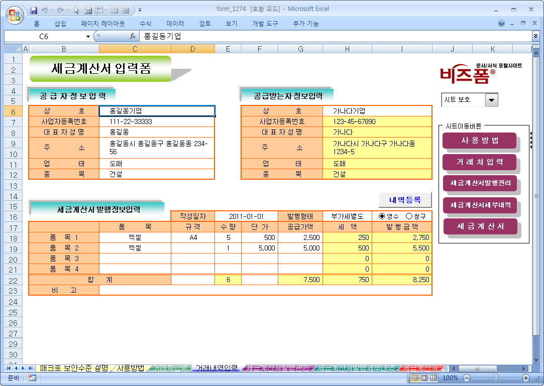 9,000원/월공급가액을 직접 입력할수 있으며, 세금계산서 발행내역을 입력하면 일자와 거래처를 선택하면 데이터를 추출하여 세금계산서 내역을 발행할 수 있는 엑셀자동화서식입니다.