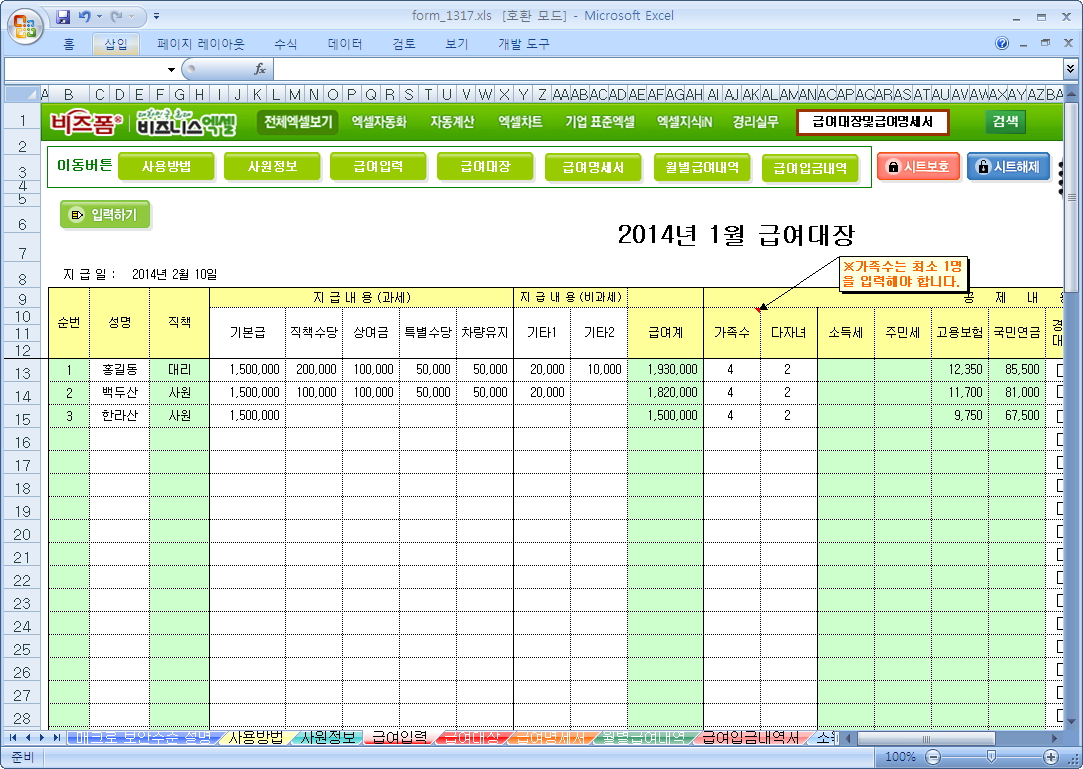 월별급여내역에 폼생성버튼을 추가하여 새문서로 저장가능하며, 월별로 급여 내역을 누적하여 1년의 급여현황을 확인 및 관리할 수 있는 자동화 서식입니다.
