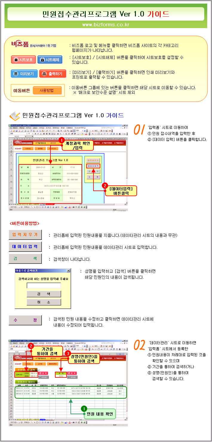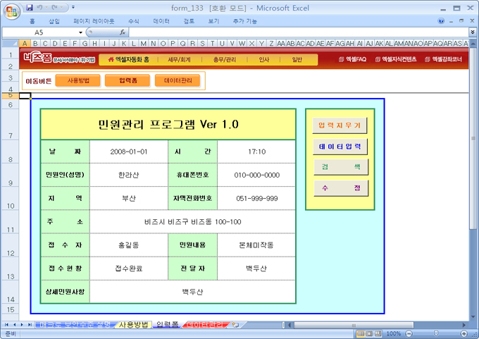 9,000원/월민원을 접수받을 때 접수일자, 시간, 민원인정보, 민원내용, 민원처리현황, 전달자 등을 등록할 수 있으며 접수된 민원데이터를 각각의 항목마다 검색이 가능하도록한 민원접수관리프로그램입니다.