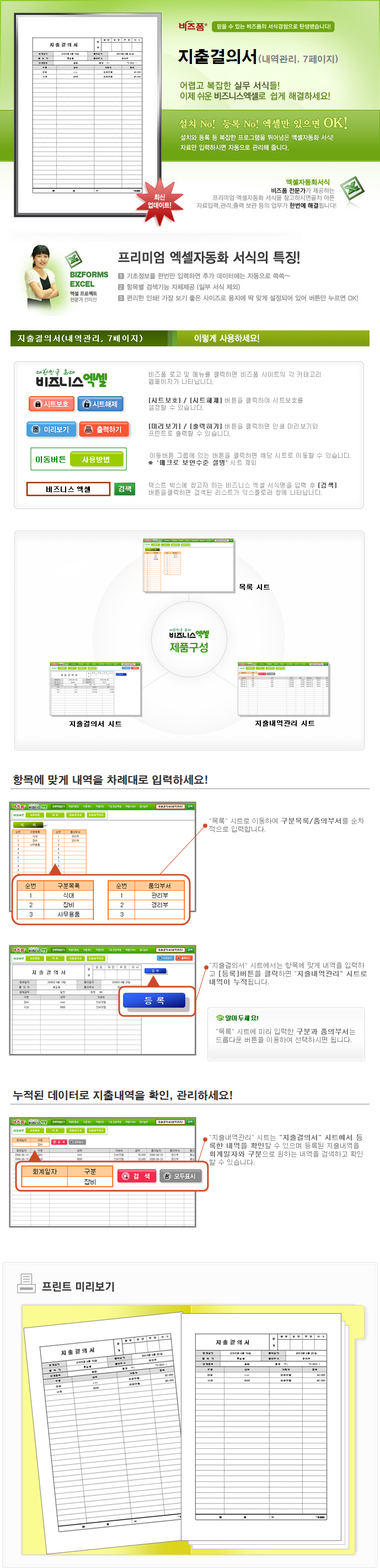 9,000원/월지출결의서를 총 7페이지까지 입력가능하며, 내역을 입력한후 바로 출력가능하며 등록버튼을 이용하여 발행내역을 누적하여 검색을 통해 내역을 관리할수 있는 엑셀자동화서식입니다.