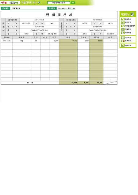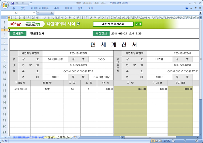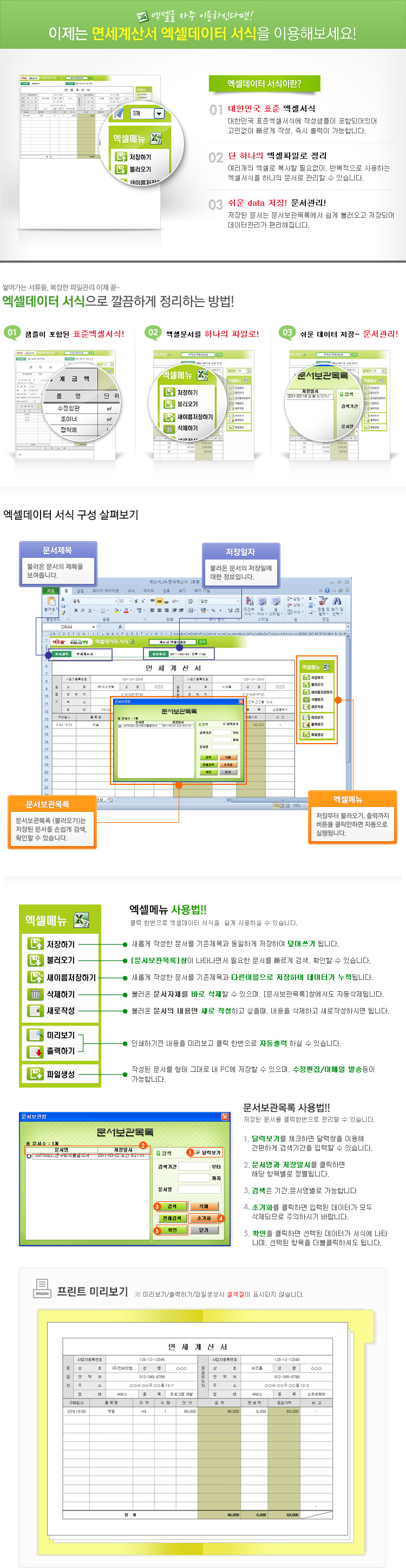 9,000원/월가로형 면세계산서로 구매일시, 품목명, 규격, 수량, 단가, 금액, 면세액, 공급가액 등 항목에 맞게 입력하여 일자별로 누적관리 가능한 엑셀데이터 서식입니다.