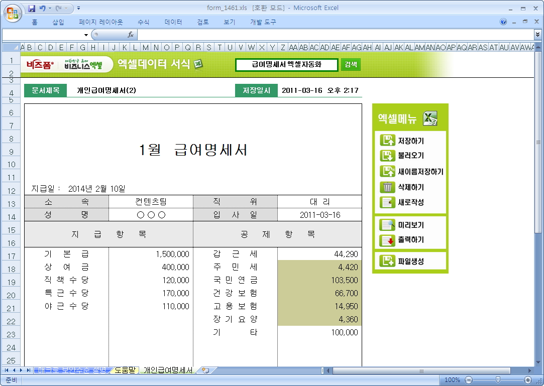 개인 급여명세서로 소속, 직위, 성명, 입사일, 지급항목, 공제항목, 지급총액, 공제총액, 실지금액 등 항목에 맞게 입력하여 일자별로 누적관리 가능한 엑셀데이터 서식입니다.