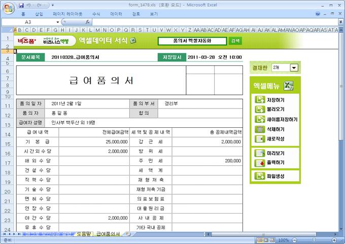 급여에 관한 품의서로 품의일자, 품의부서, 품의자, 합의, 급여자 성명, 급여내역, 세액 및 공제내역 등 항목에 맞게 입력하여 일자별로 누적관리 가능한 엑셀데이터 서식입니다.