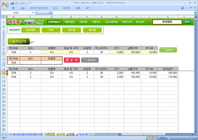 거래하는 제품의 면세/과세항목을 구분하여 각 박스당갯수를 지정하여 거래내역을 입력하면 자동으로 계산되어 누적관리하고 코드/제품명으로 데이터를 추출할 수 있는 엑셀자동화서식입니다.