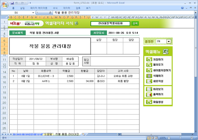 9,000원/월택배관리시 착불상품의 경우 별도로 관리할 수 있으며, 제품내역, 착불금, 환불금등의 항목으로 입력하고 누적관리 할 수 있는 엑셀데이터 서식입니다.