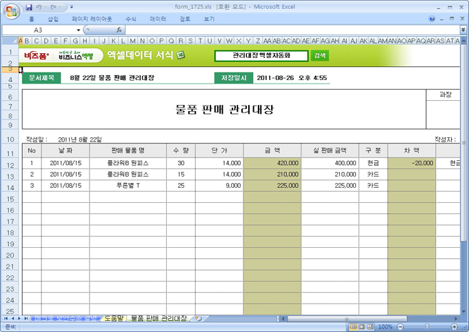9,000원/월물품판매시 판매되는 물품명, 날짜, 수량, 실판매금액등의 항목을 입력하고, 차액이 자동으로 계산되어 누적관리 할 수 있는 엑셀데이터 서식입니다.