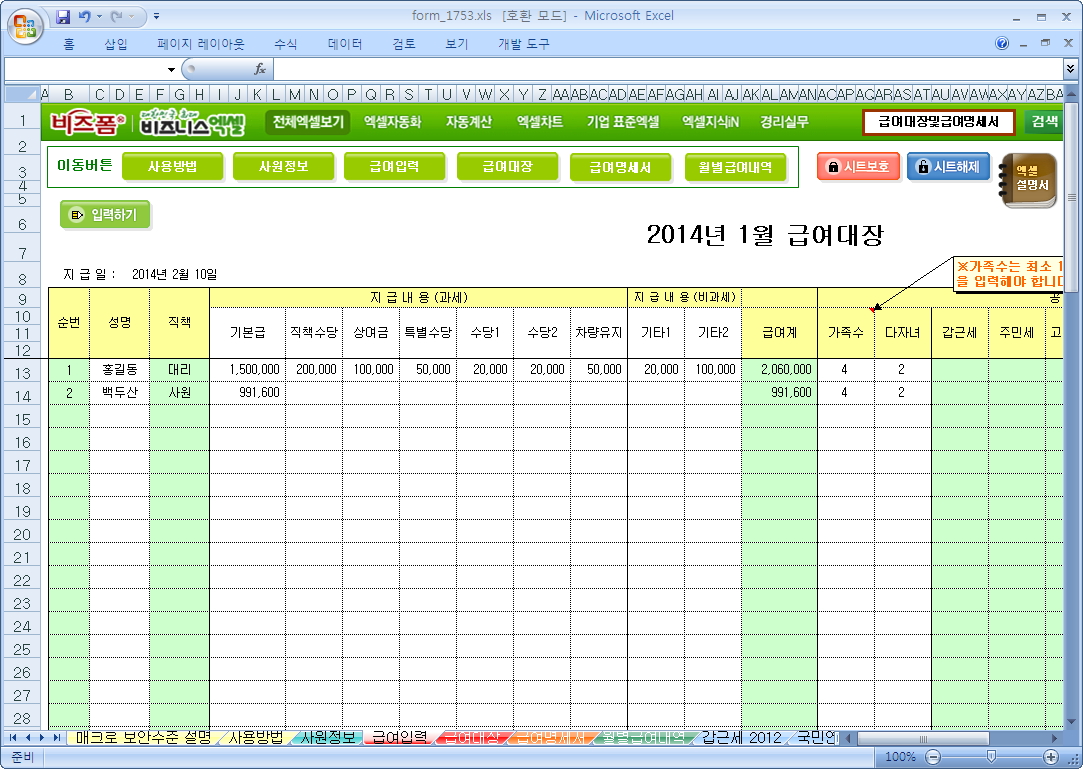 과세항목을 7칸까지 입력할 수 있으며, 급여내역을 입력폼에서 입력하면 급여대장과 급여명세서를 출력할 수 있으며 월별로 급여 내역을 누적하여 1년의 급여현황을 확인 및 관리할 수 있는 자동화 서식입니다.