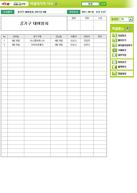 9,000원/월공기구 관리를 위한 대여일지로 대여일, 공기구명, 반납일, 차용자, 대여자, 확인 등 항목에 맞게 입력하여 일자별로 누적관리 가능한 엑셀데이터 서식입니다.