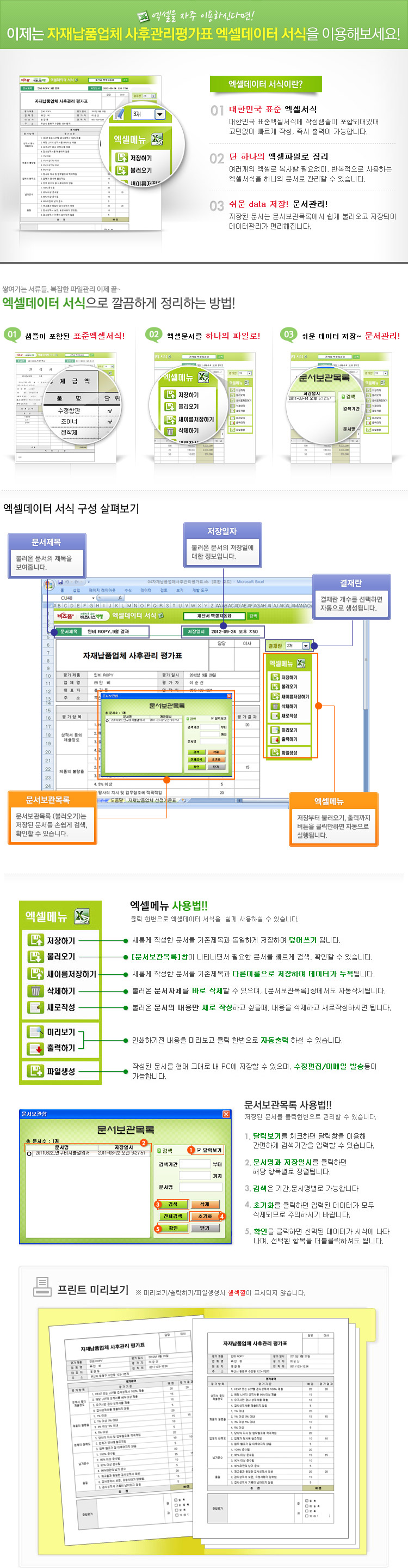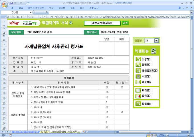 9,000원/월자재납품 업체별로 사후관리를 체크하고 평가 기록할 수있는 자재납품업체 사후관리 평가표로 업체별로 저장/수정/불러오기가 가능한 엑셀데이터 서식입니다.