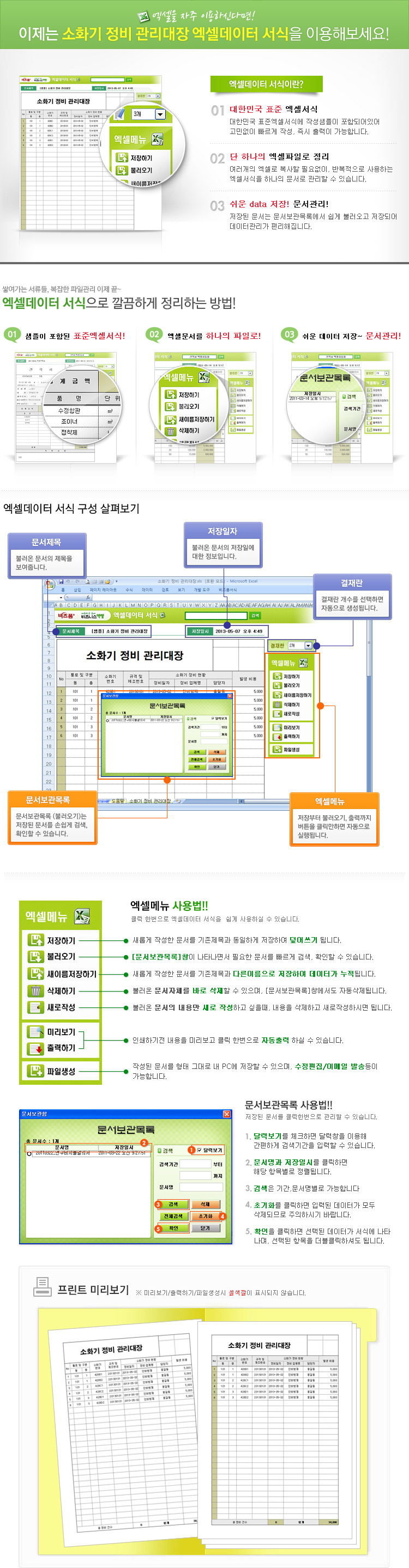 9,000원/월아파트나 건물 관리자가 소화기 정비 사항을 기록/관리 할 수 있는 서식으로 위치에 대한 정보와 함께 소화기 번호, 규격 및 제조번호, 정비일자, 정비업체, 담당자와 발생비용을 함께 기재하여 사용 할 수 있습니다. 작성 건별로 저장, 수정, 불러오기, 별도 파일로 저장이 가능한 엑셀 데이터 서식입니다.