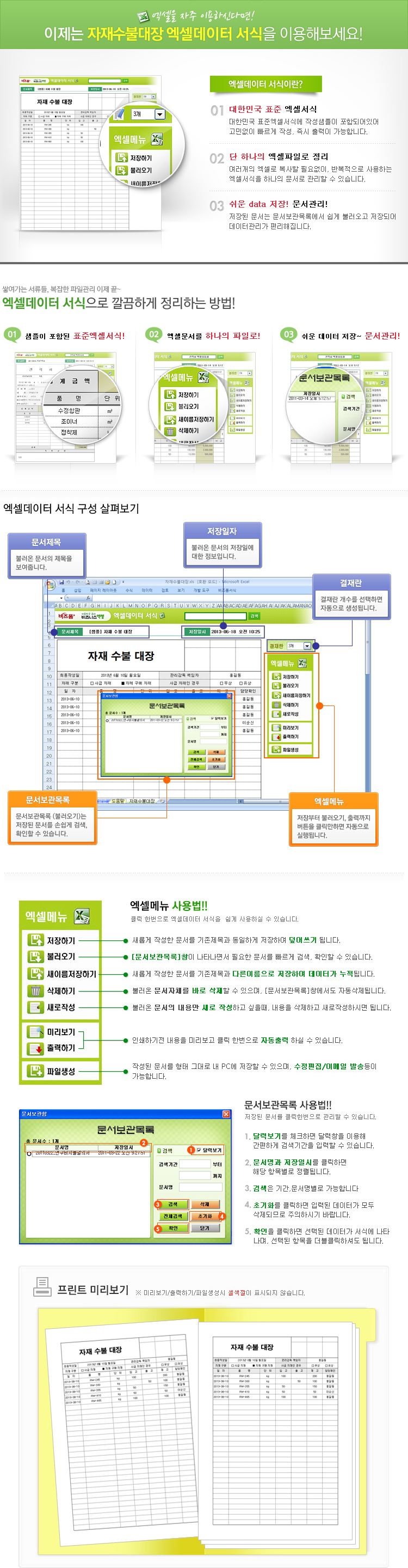 9,000원/월사급자재, 자체 구매자재 등으로 구분하여 일자별로 입출고, 재고 내용을 기록할 수 있는 자재수불대장입니다. 한 페이지에 29건씩 입력이 가능하며, 각 페이지를 건별로 저장, 수정, 불러오기, 별도 파일로 저장이 가능한 엑셀 데이터 서식입니다.