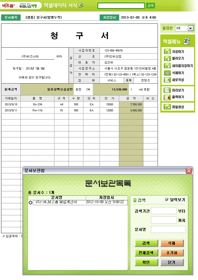 9,000원/월기본적인 형태의 청구서 양식으로 공급자 정보는 고정으로 기록이 유지되면서 공급받는자 정보와 내역이 발행건별로 누적관리 할 수 있습니다. 수량x단가로 금액이 자동 계산되고, 합계금액에서 자동으로 세액까지 더해집니다. 발행 건별로 저장, 수정, 불러오기, 별도 파일로 저장이 가능한 엑셀 데이터 서식입니다.