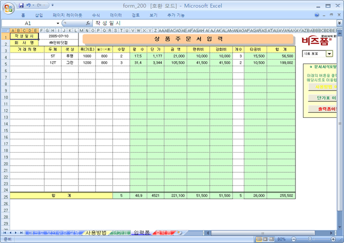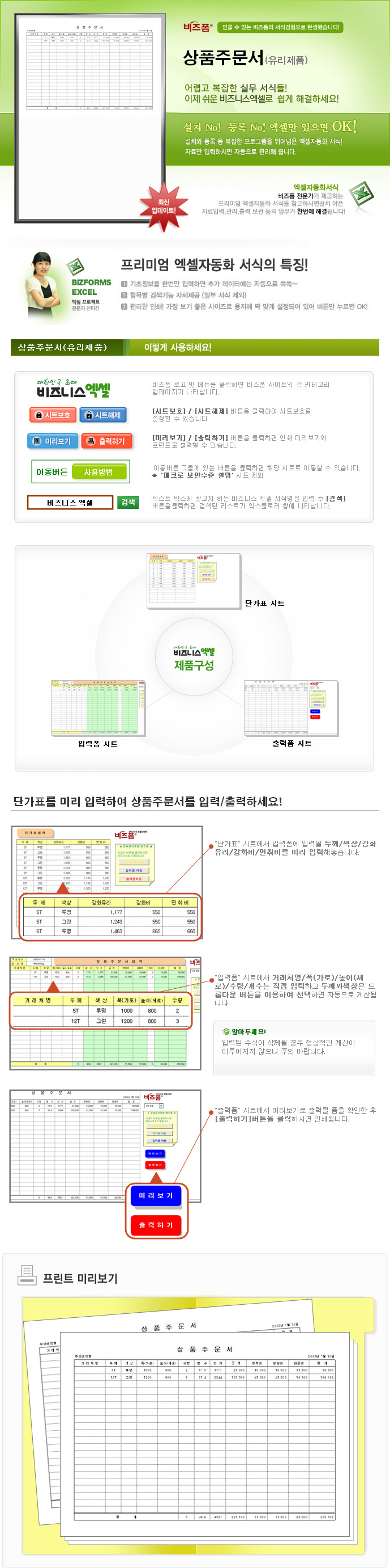 9,000원/월유리제품의 상품주문서 자동화 서식으로서 거래처, 두께, 색상, 면적등의 기본정보를 입력하면 해당 제품의 단가 평수 및 금액 뿐만 아니라 각 작업비등을 자동으로 계산해 주는 자동화 서식입니다. 여러차례 계산을 해야 하는 번거로움을 덜 수 있어 동종업계에서 유용하게 사용할 수 있습니다.