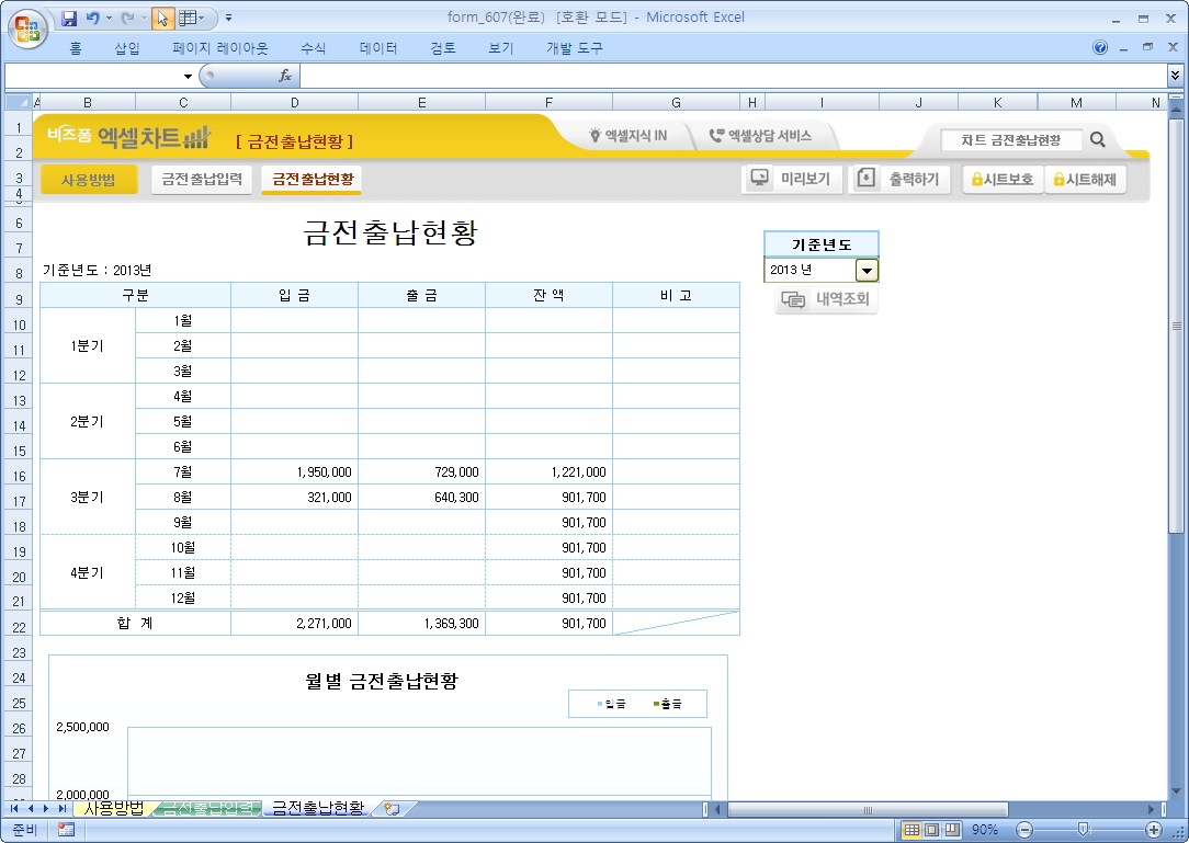 일자별로 입력된 금전출납내역의 잔액을 버튼하나로 간단히 계산함과 동시에 년/월별로 검색할 수 있으며, 월별 입/출금 합계 및 잔액에 대해 세로막대형 차트로 나타날 수 있는 엑셀자동차트입니다.