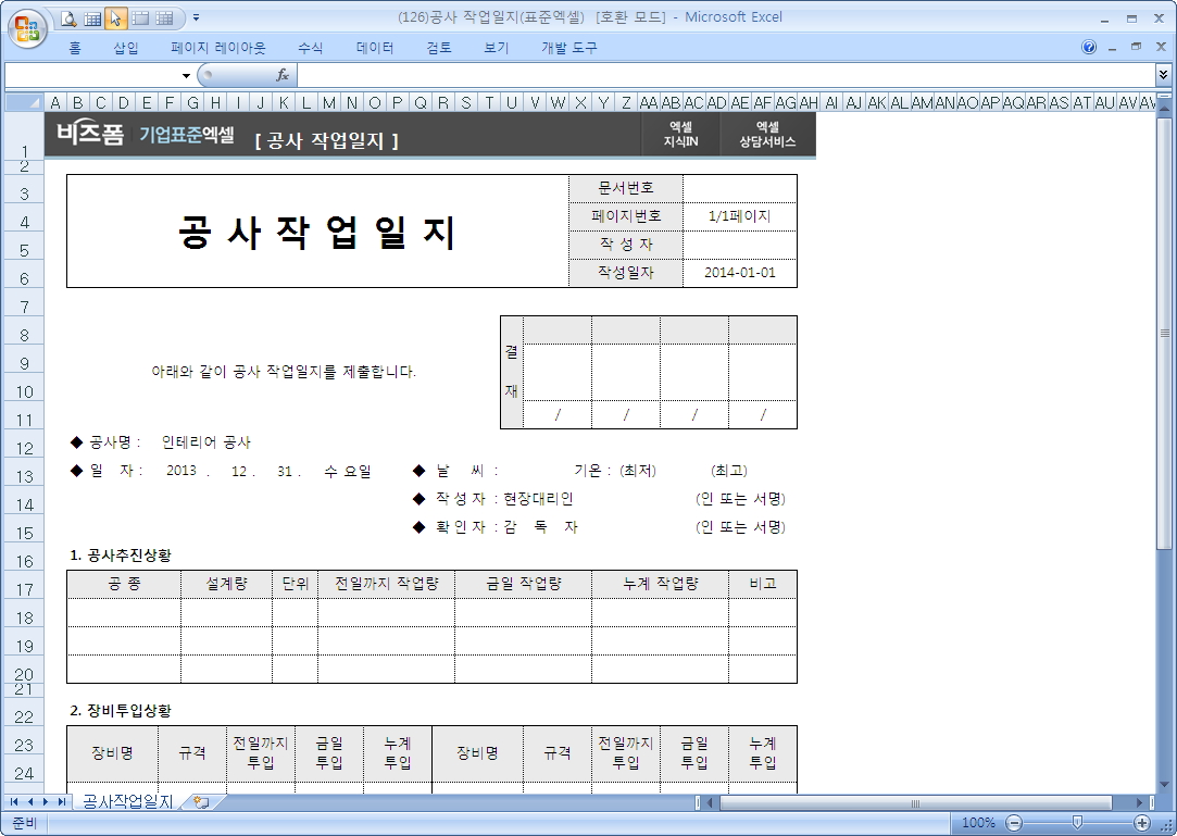 공사 추진 상황과 참여자 명단을 쉽게 파악가능한 공사 작업 일지입니다. 공사명, 일자, 날짜, 작성자, 확인자, 공사추진 상황, 장비투입상황, 인력투입상황, 주요작업 참여자 명단 등으로 구성되어 있습니다.