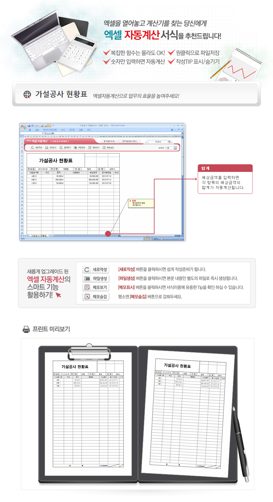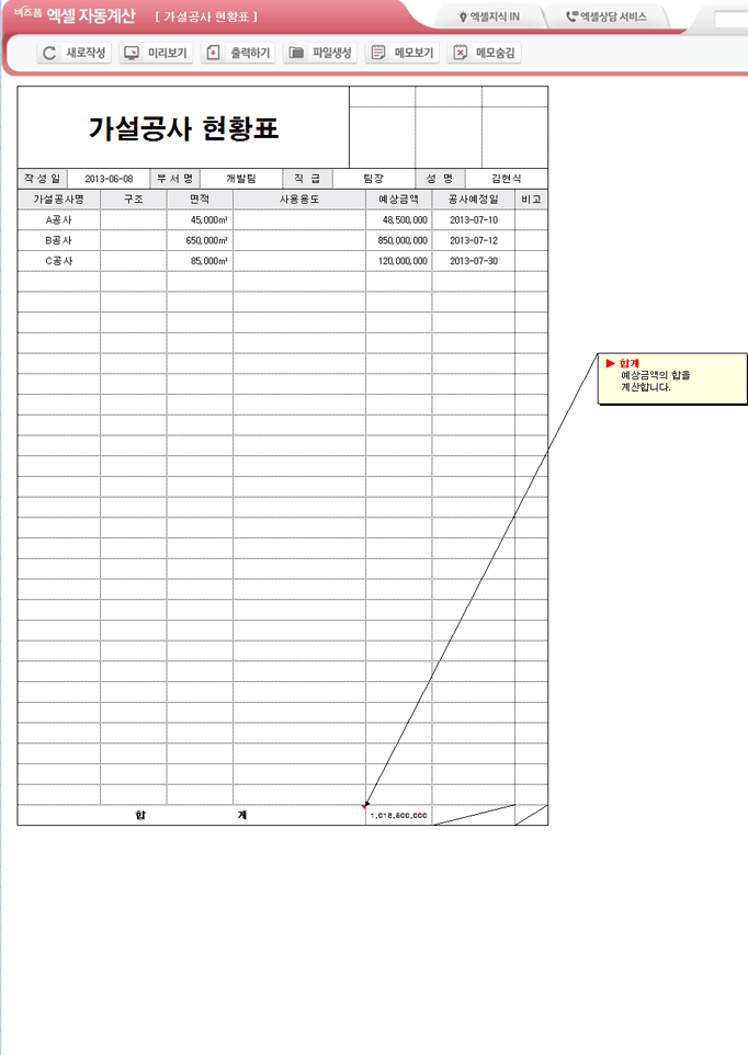 9,000원/월엑셀 자동계산 가설공사 현황표입니다. 가설공사명, 구조, 면적, 사용용도, 예상금액, 공사예정일,의 항목으로 구성되어 있습니다. 예상금액을 입력하면 합계가 자동계산되며, 별도 파일로 저장 가능한 파일생성, 손쉽게 다시 작성이 가능한 새로작성 기능, 결재란 자동조절 기능이 포함되어 있습니다.