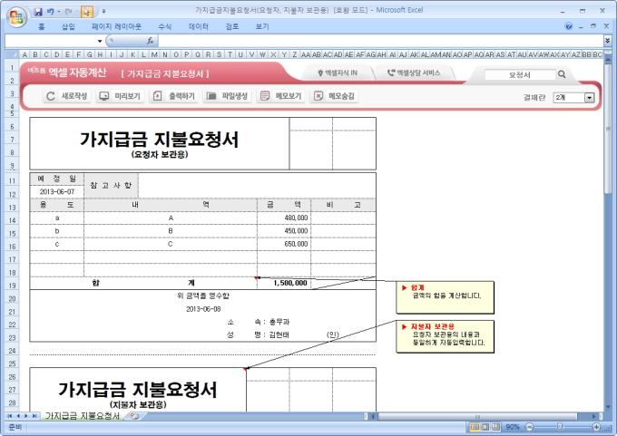 9,000원/월엑셀 자동계산 가지급금지불요청서(요청자, 지불자 보관용)입니다. 예정일, 참고사항, 용도, 내역, 금액 등의 항목으로 구성되어 있습니다. 요청자보관용 입력 시 지불자 보관용은 동일하게 자동입력 되며 금액의 합계가 자동계산되며, 별도 파일로 저장 가능한 파일생성, 손쉽게 다시 작성이 가능한 새로작성 기능, 결재란 자동조절 기능 이 포함되어 있습니다.