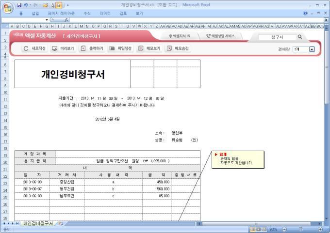 9,000원/월엑셀 자동계산 개인경비청구서입니다. 총지급액, 거래처, 사용내역, 금액, 증빙서류의 항목으로 구성되어 있습니다. 금액을 입력하면 합계가 자동계산되며, 별도 파일로 저장 가능한 파일생성, 손쉽게 다시 작성이 가능한 새로작성 기능, 결재란 자동조절 기능이 포함되어 있습니다.