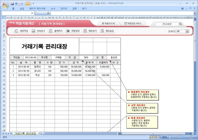 9,000원/월엑셀 자동계산 거래기록 관리대장입니다. 날짜, 품명, 수량, 단가, 금액, 결제액, 미결제액 등의 항목으로 구성되어 있습니다. 수량*단가인 금액과 금액-결제액인 미결제액, 그리고 각 항목의 합계가 자동계산되며, 별도 파일로 저장 가능한 파일생성, 손쉽게 다시 작성이 가능한 새로작성 기능, 결재란 자동조절 기능 이 포함되어 있습니다.