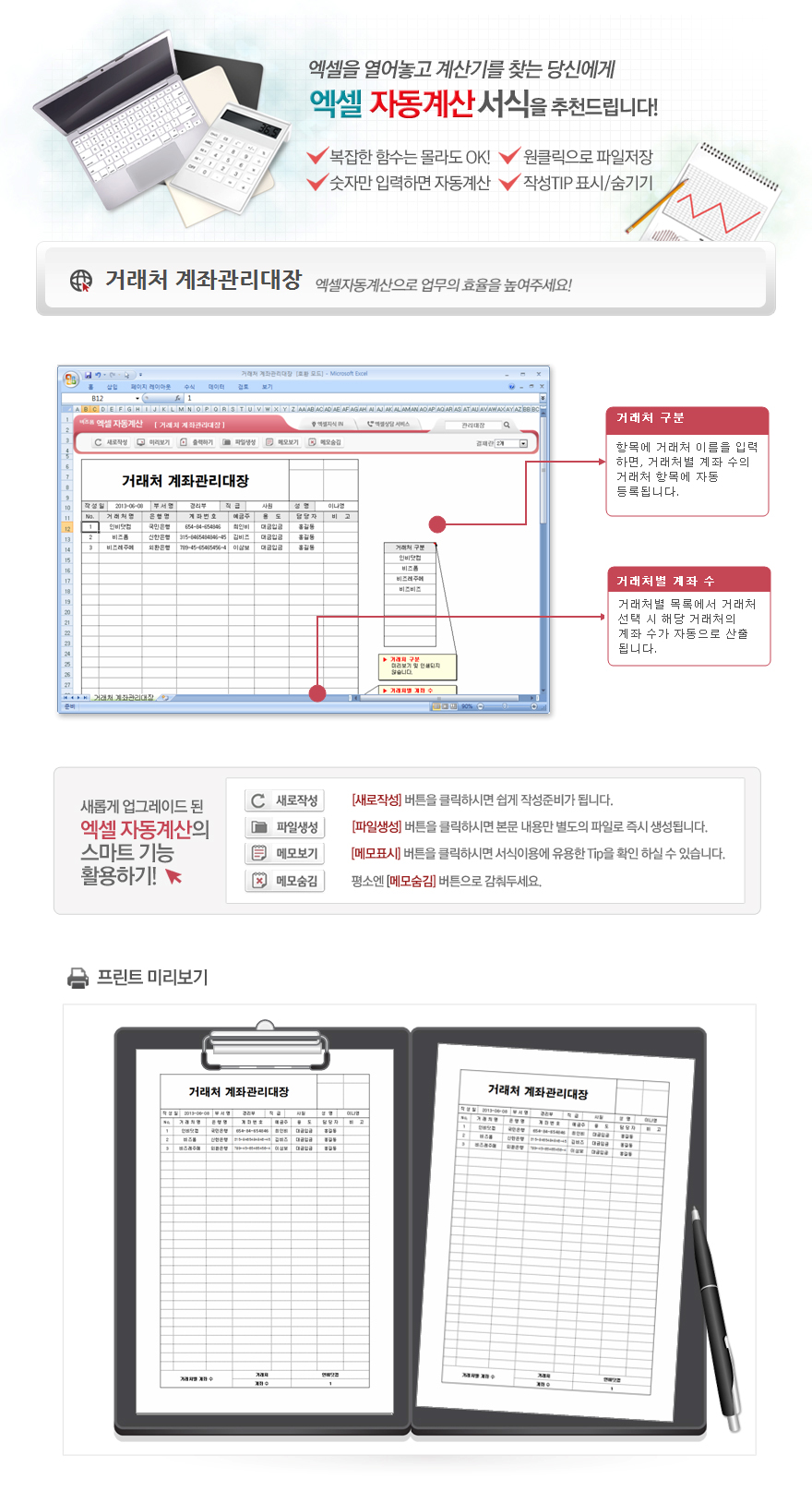 9,000원/월엑셀 자동계산 거래처 계좌관리대장입니다. 거래처명, 은행명, 계좌번호, 예금주, 용도, 담당자 등의 항목으로 구성되어 있습니다. 하단 거래처 항목 선택 시 해당하는 거래처의 총 계좌의 수가 자동산출되며, 별도 파일로 저장 가능한 파일생성, 손쉽게 다시 작성이 가능한 새로작성 기능, 결재란 자동조절 기능 이 포함되어 있습니다.