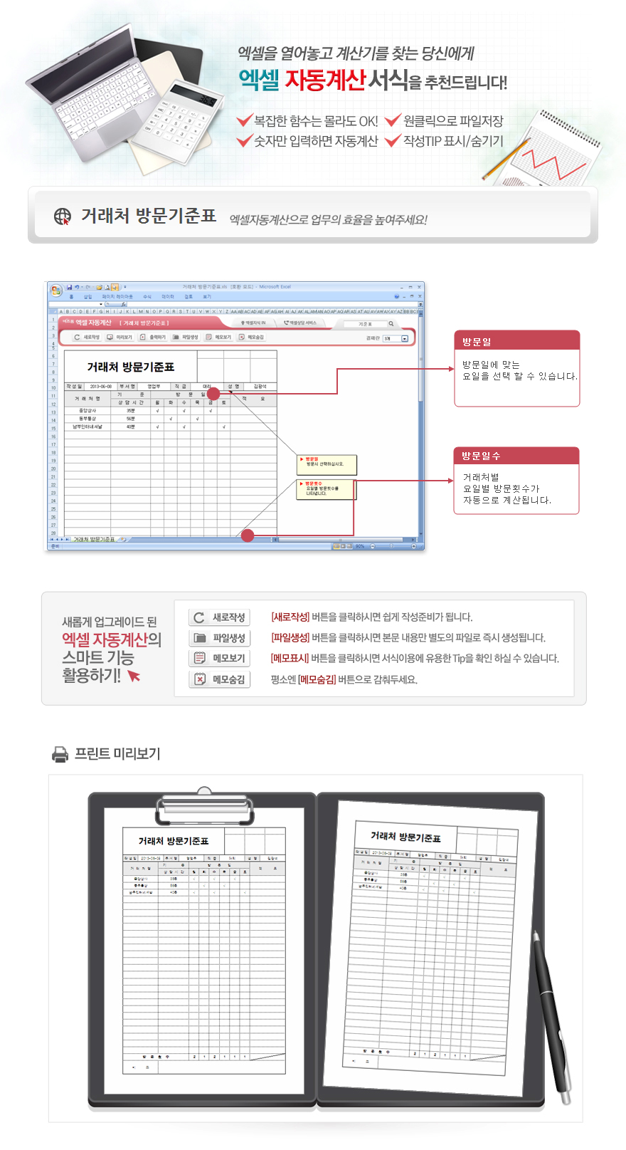 9,000원/월엑셀 자동계산 거래처 납품실적카드입니다. 거래처정보, 날짜, 품목, 규격, 수량, 단가, 금액, 납품장소 등의 항목으로 구성되어 있습니다. 수량과 단가를 곱한 금액과 수량, 단가, 금액의 합계가 자동계산되며, 별도 파일로 저장 가능한 파일생성, 손쉽게 다시 작성이 가능한 새로작성 기능, 결재란 자동조절 기능 이 포함되어 있습니다.