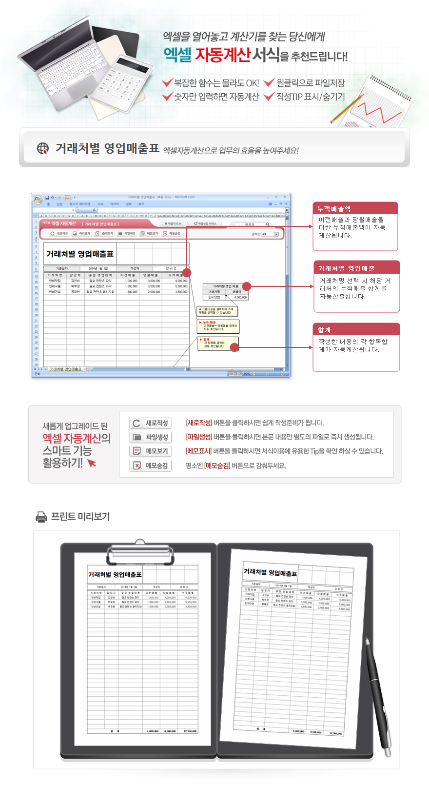 9,000원/월엑셀 자동계산 거래처별 영업매출표입니다. 거래처명, 담당자, 중점 영업대책, 이전매출, 당월매출, 누적매출 등의 항목으로 구성되어 있습니다. 본문 옆 참조표에 거래처명 입력 시 매출액이 산출되고, 이전매출+당월매출로 누적매출을, 그리고 각 항목의 합계가 자동계산되며, 별도 파일로 저장 가능한 파일생성, 손쉽게 다시 작성이 가능한 새로작성 기능, 결재란 자동조절 기능 이 포함되어 있습니다.