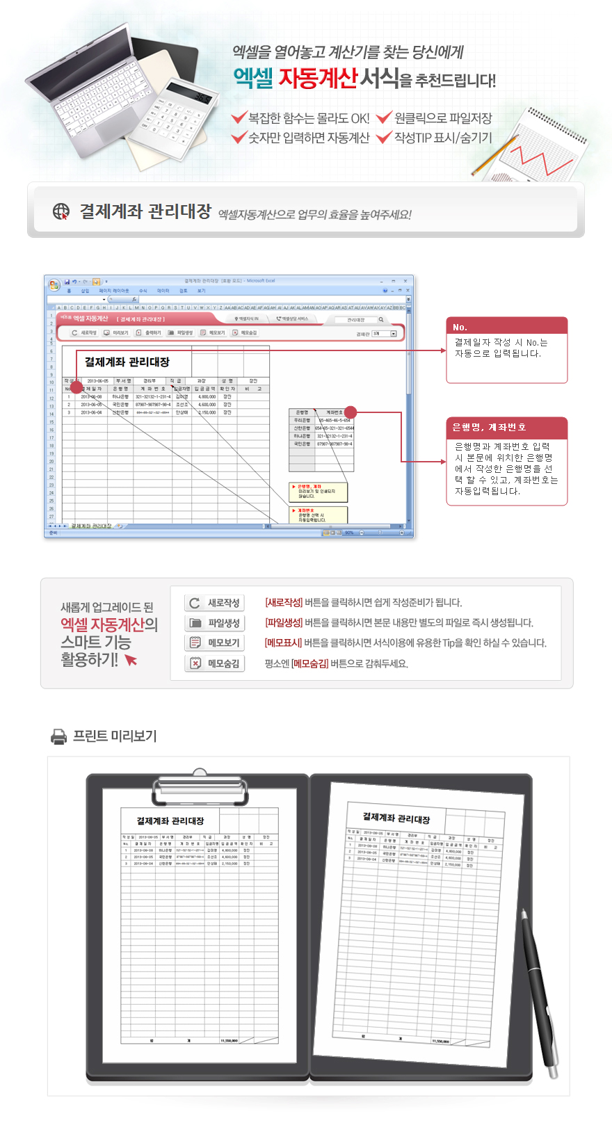 9,000원/월엑셀 자동계산 결제계좌 관리대장입니다. 작성자 정보와, 결제일자, 은행명, 계좌번호, 입금자명, 입금금액, 확인자 등의 항목으로 구성되어 있습니다. 오른쪽 참조표 작성 후 본문의 은행명 선택 시 계죄번호가 자동입력되며, 별도 파일로 저장 가능한 파일생성, 손쉽게 다시 작성이 가능한 새로작성 기능, 결재란 자동조절 기능 이 포함되어 있습니다.